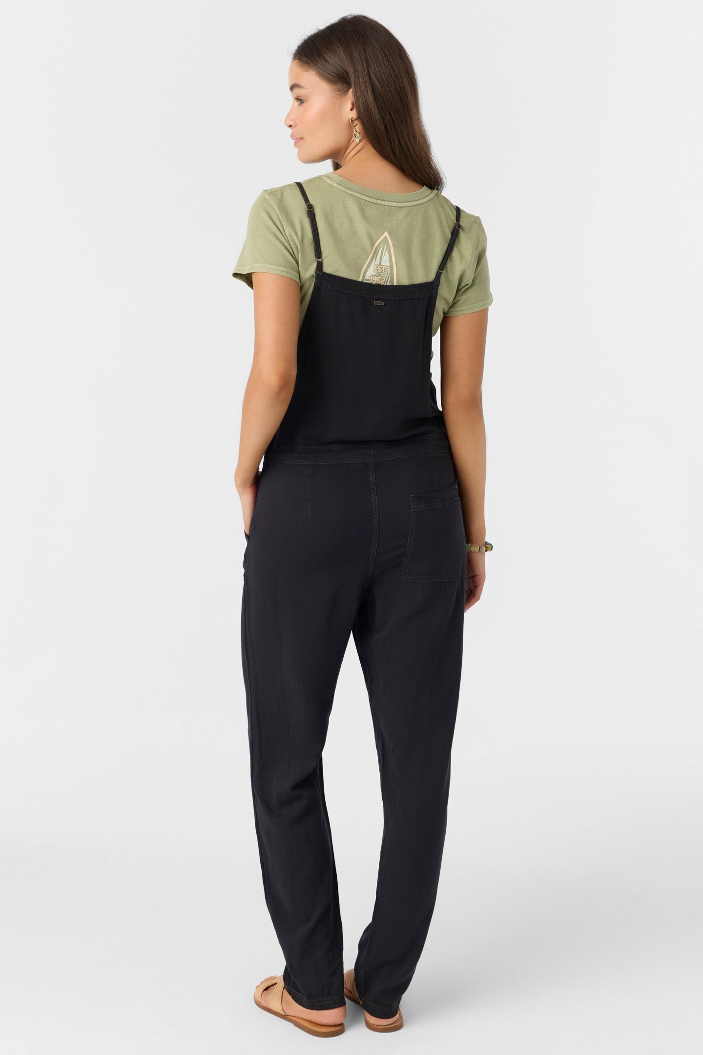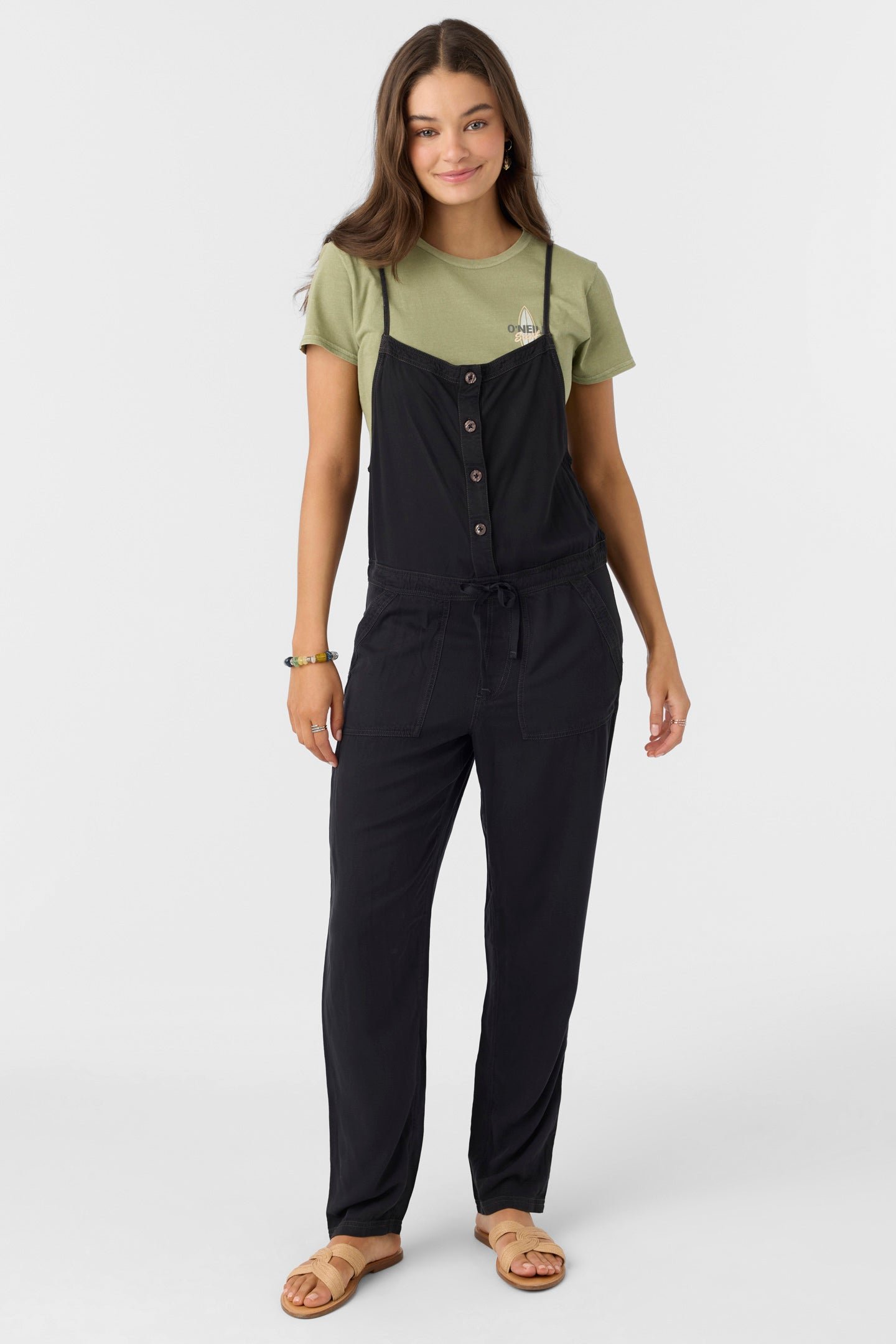Laid-back woven jumper that features a front button design, over the shoulder straps and a straight leg fit.