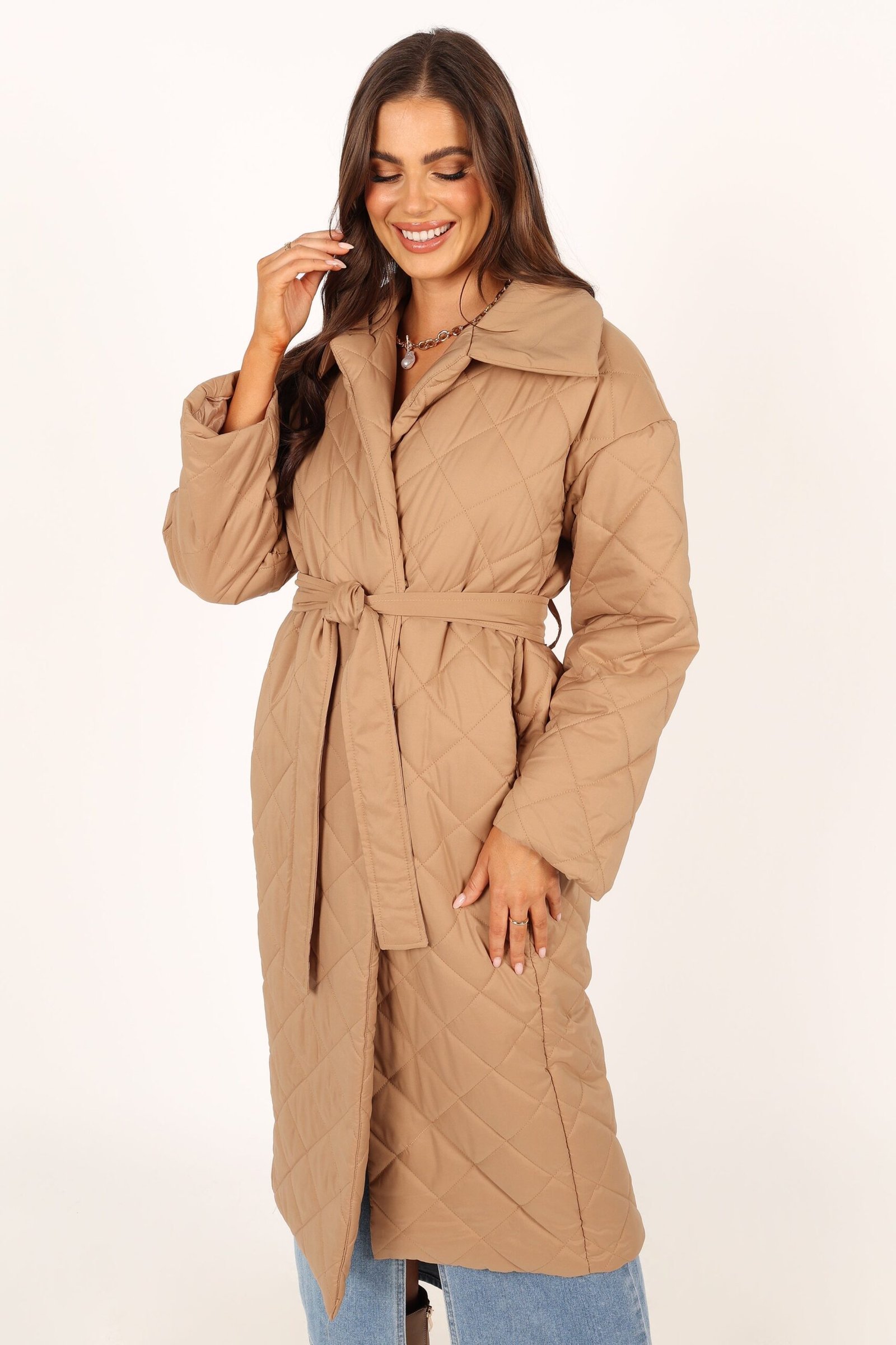 DETAILS This winter season, stay warm and stylish with our quilted camel-coloured coat. Crafted from a silky fabric, this timeless piece features a classic collar, long sleeves with functional press stud button close and two side pockets with zip closure for convenience.