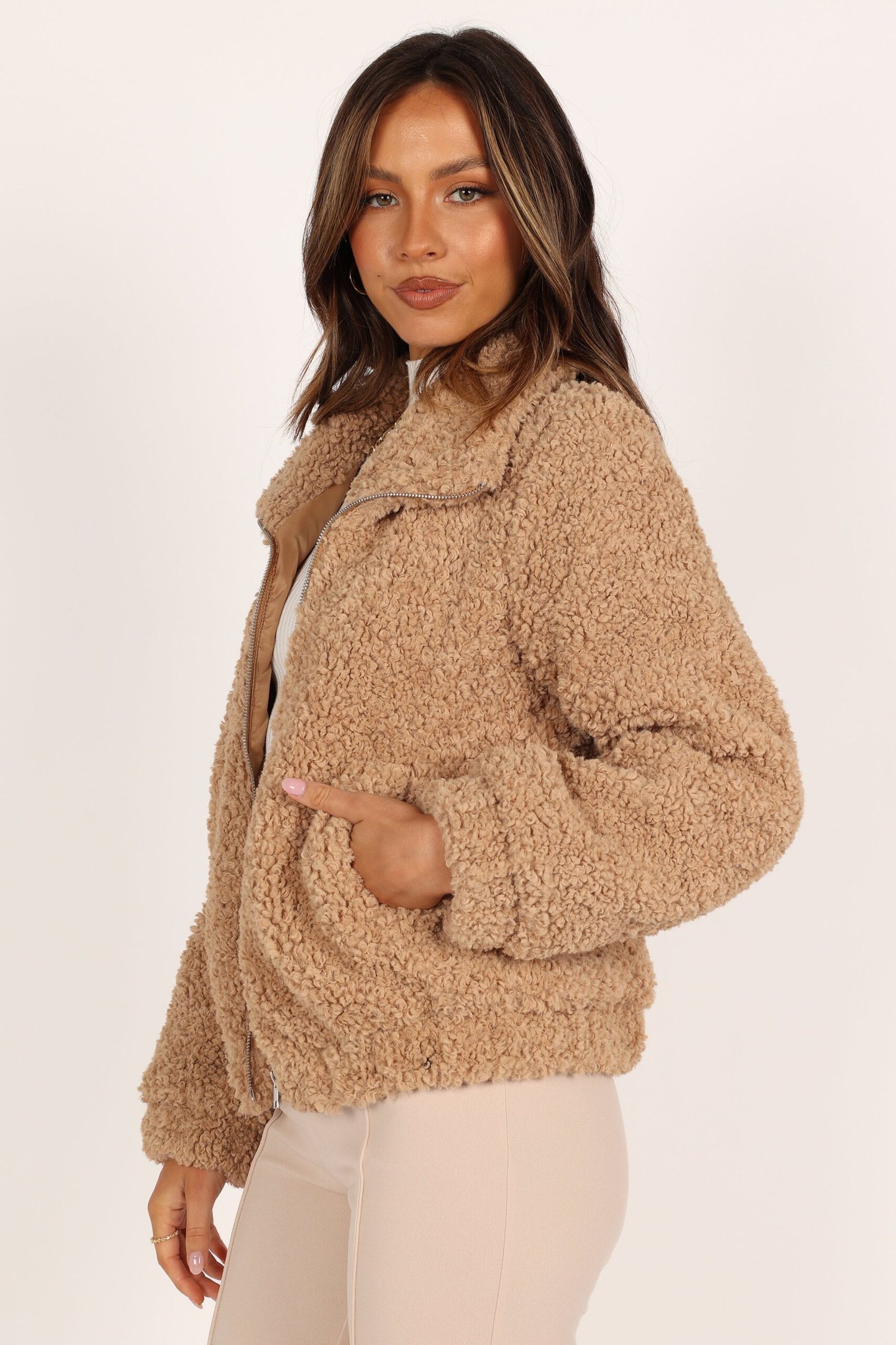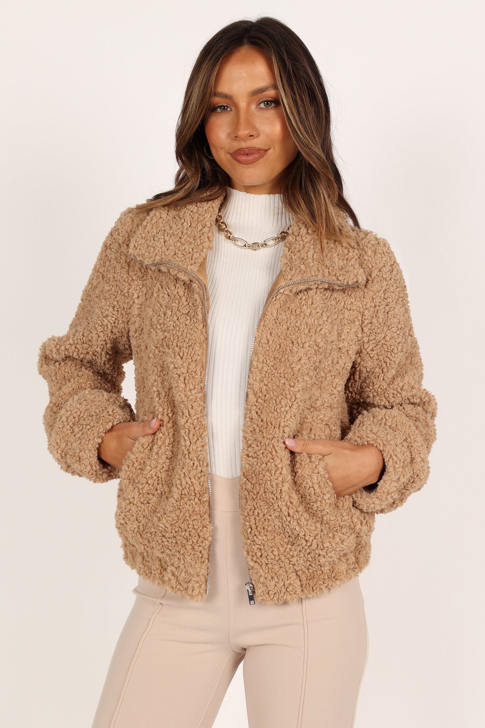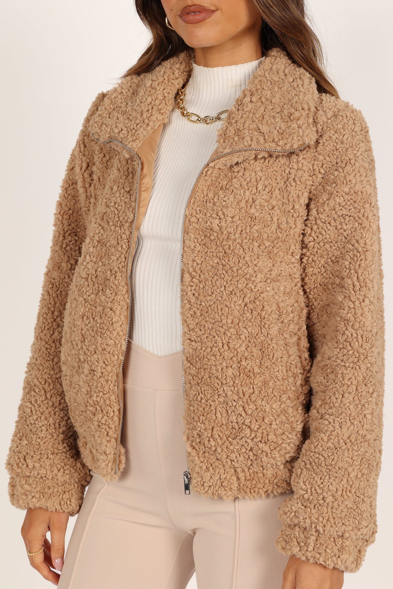 Zip Front Teddy Jacket – Camel