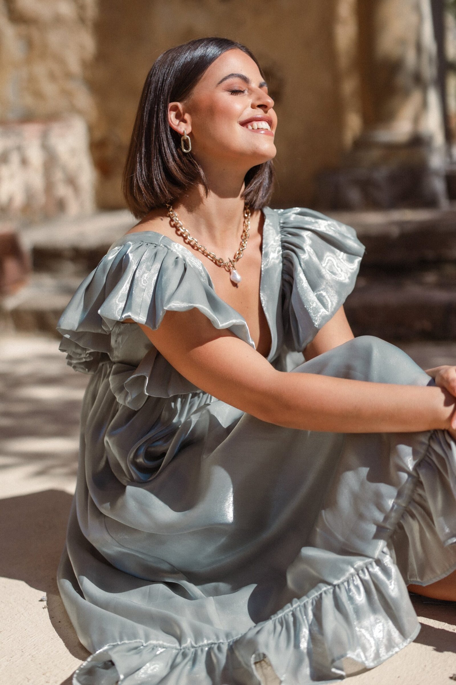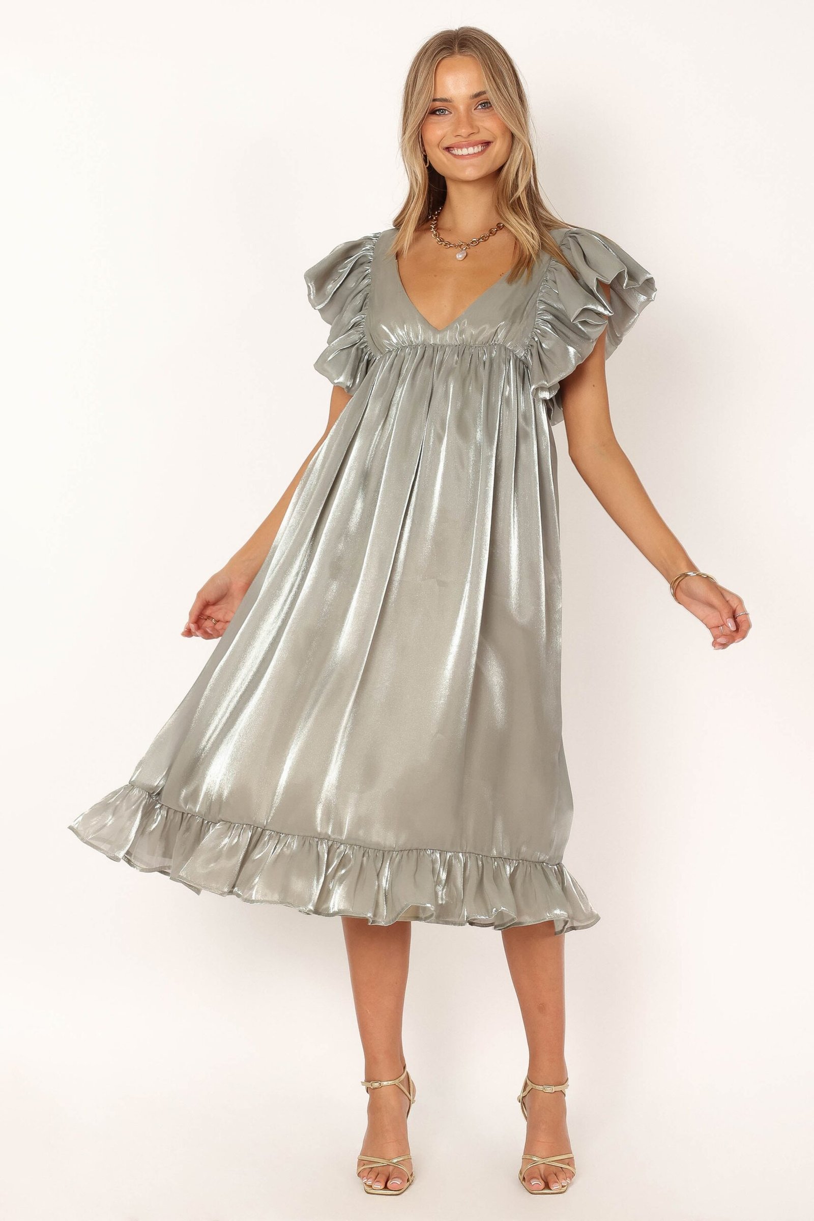 DETAILS Introducing the perfect piece for any special occasion! This maxi dress is made from a luxurious satin sheen material and features an elegant V-neckline, short ruffle sleeves, and a ruffle hem. The back has an invisible zip fastening with hook and eye clasp, as well as a subtle back split that makes it the ideal eventwear.