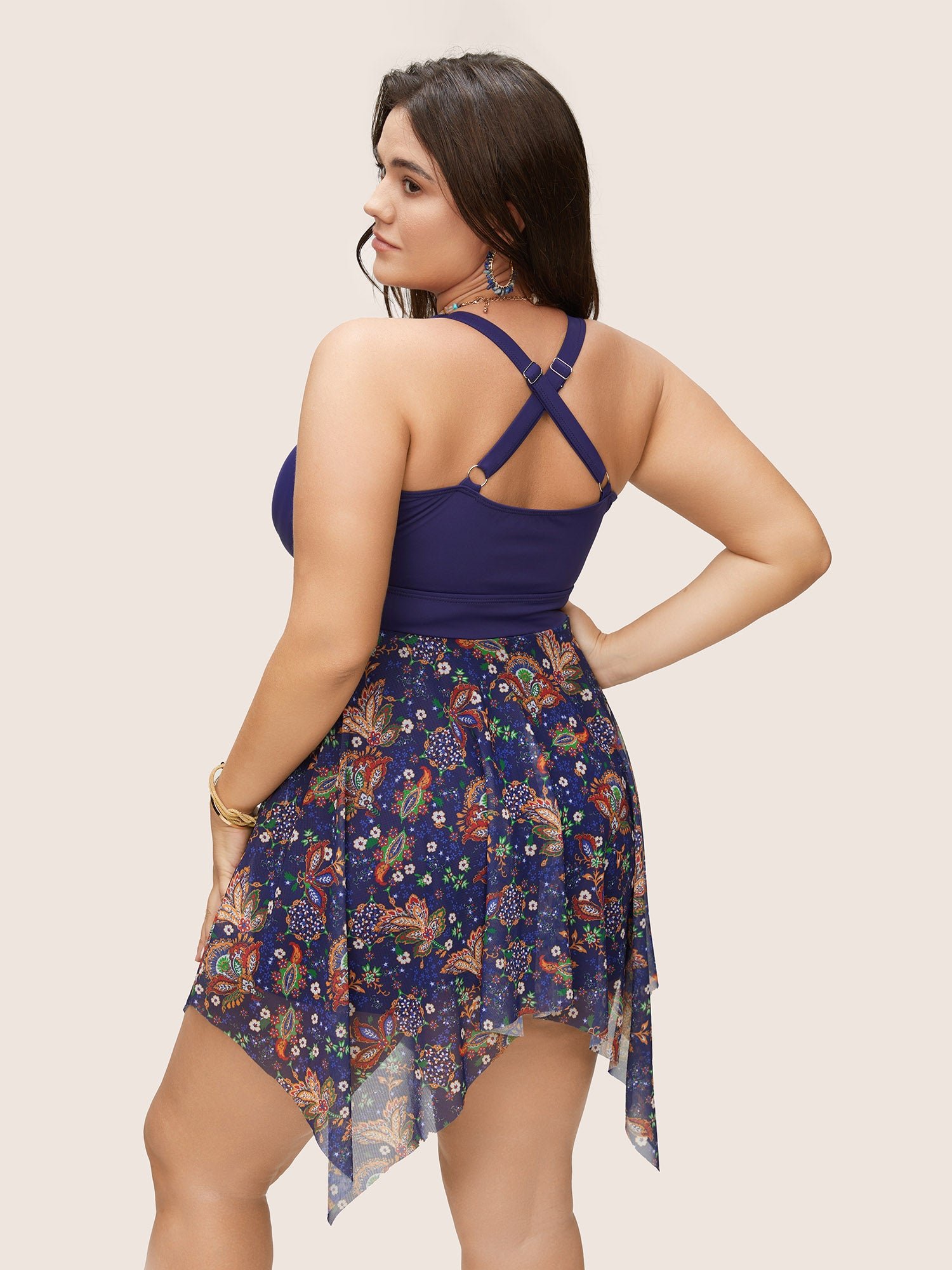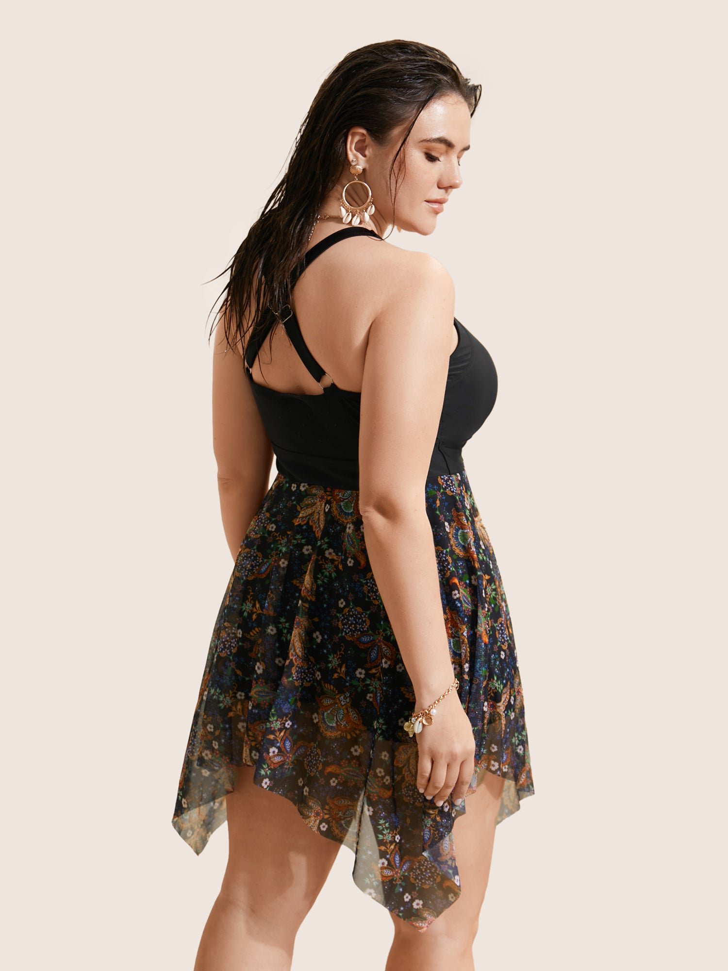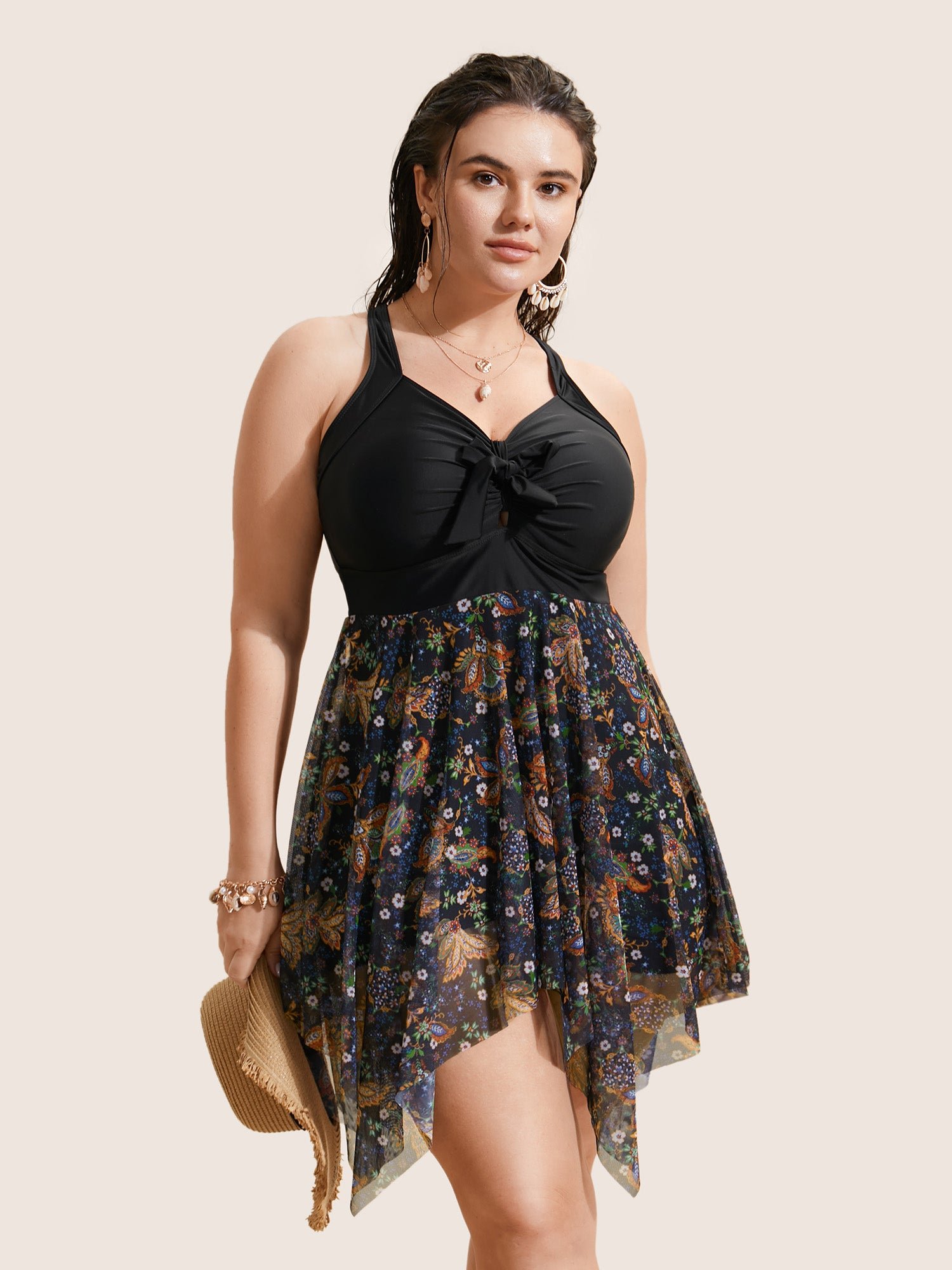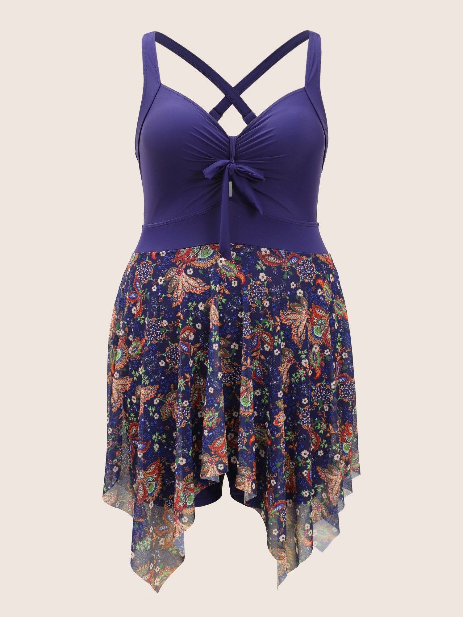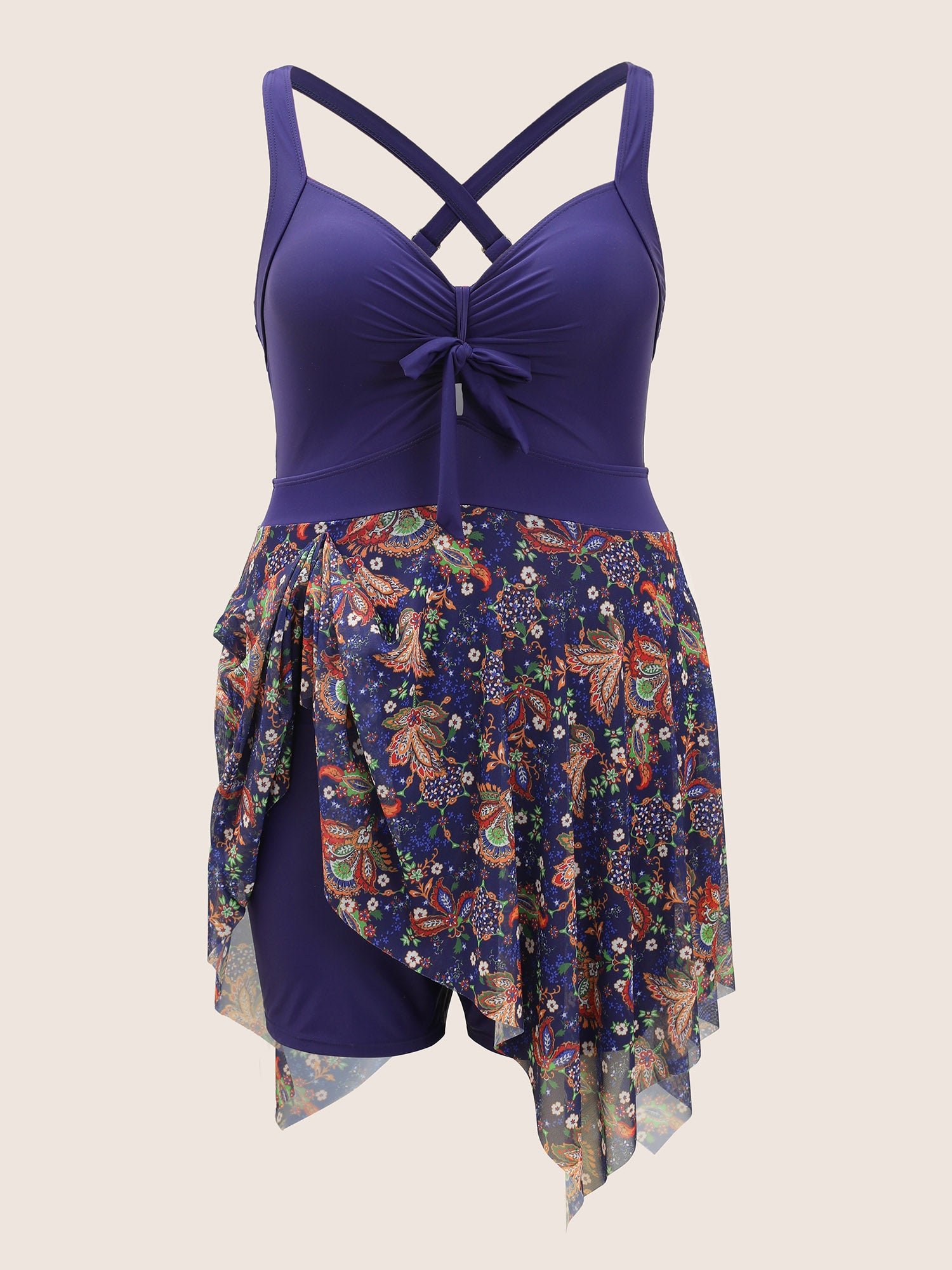 Patchwork Ruched Knot Asymmetrical Hem Swim Dress