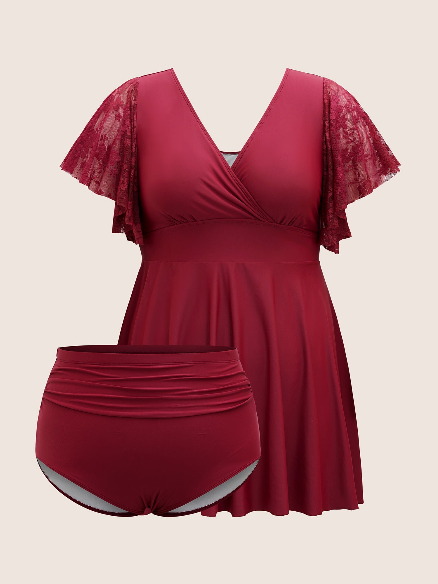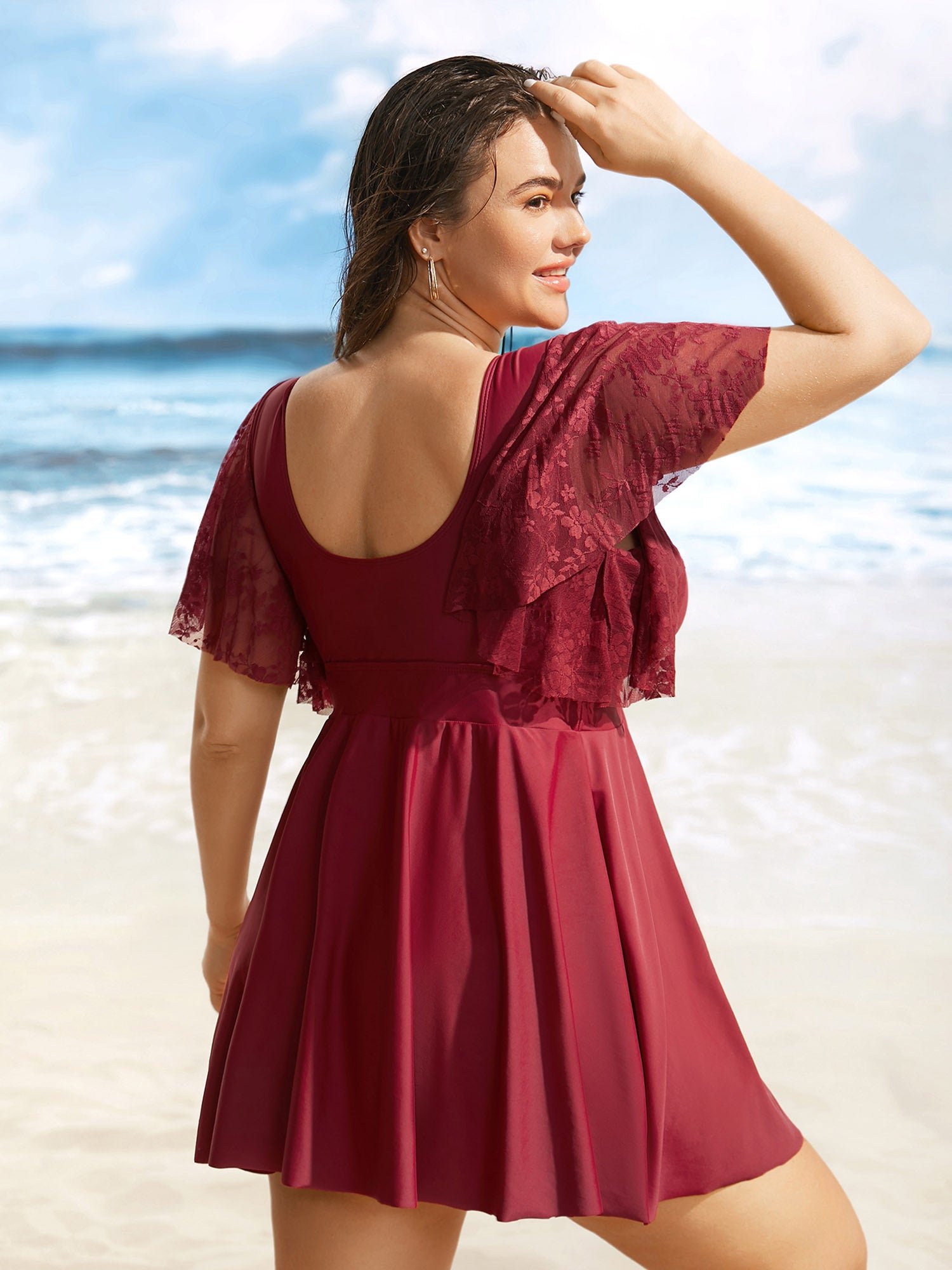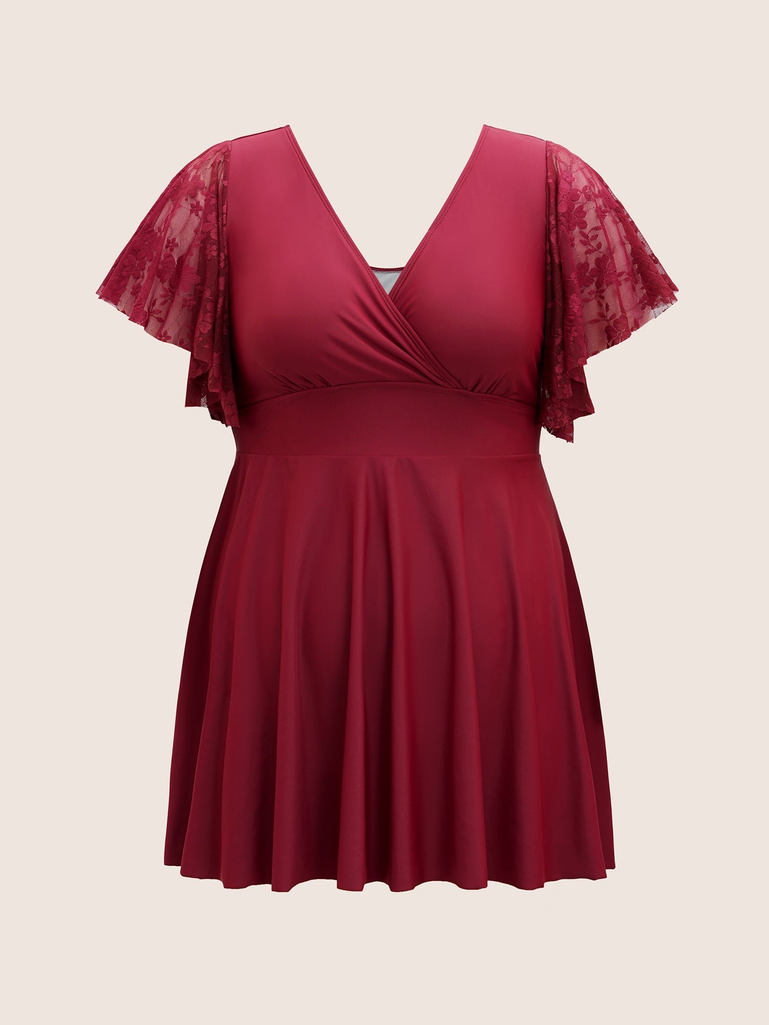 Solid Overlap Collar Lace Patchwork Gathered Swim Dress