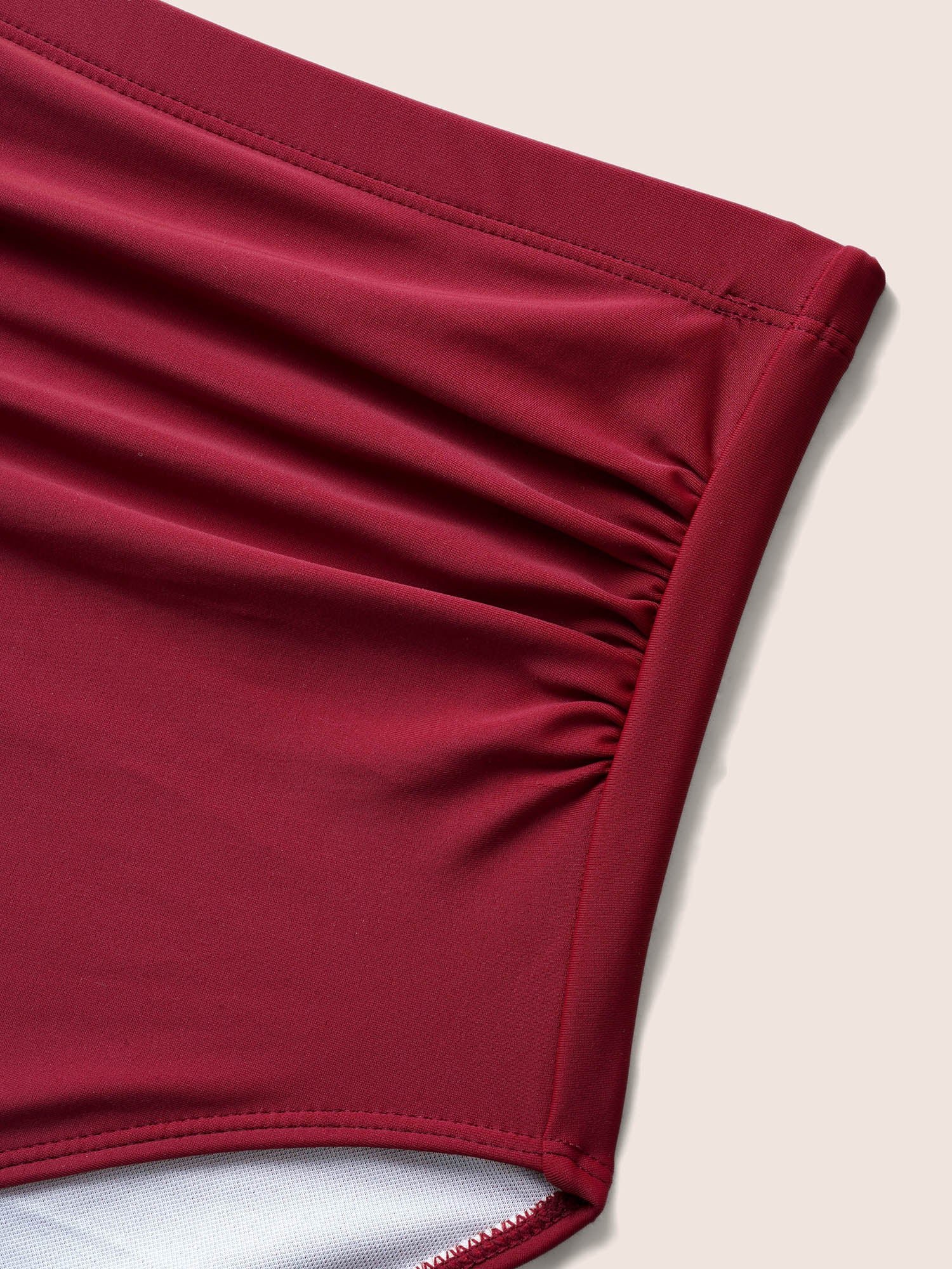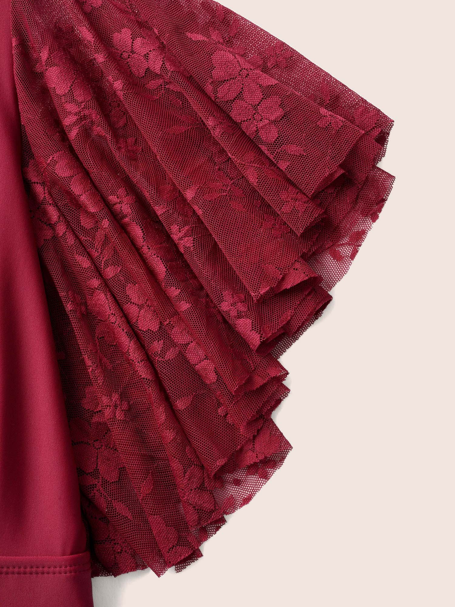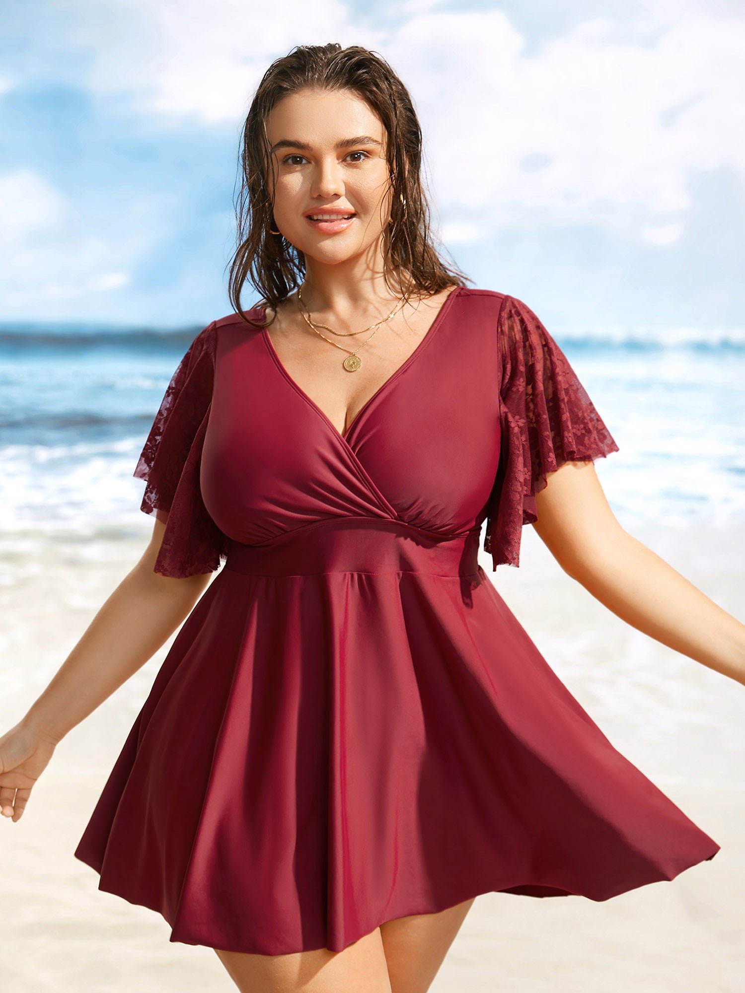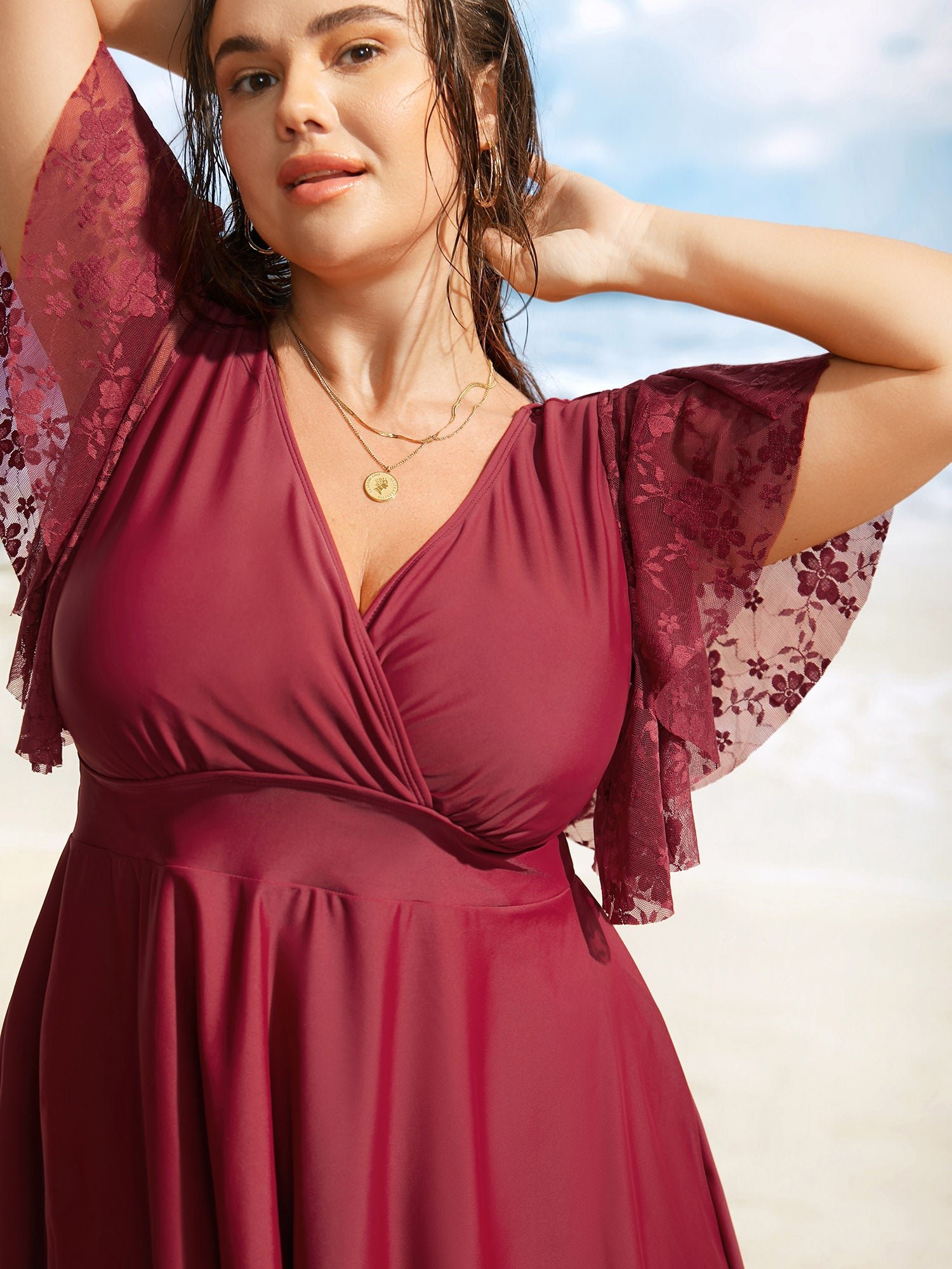 Solid Overlap Collar Lace Patchwork Gathered Swim Dress