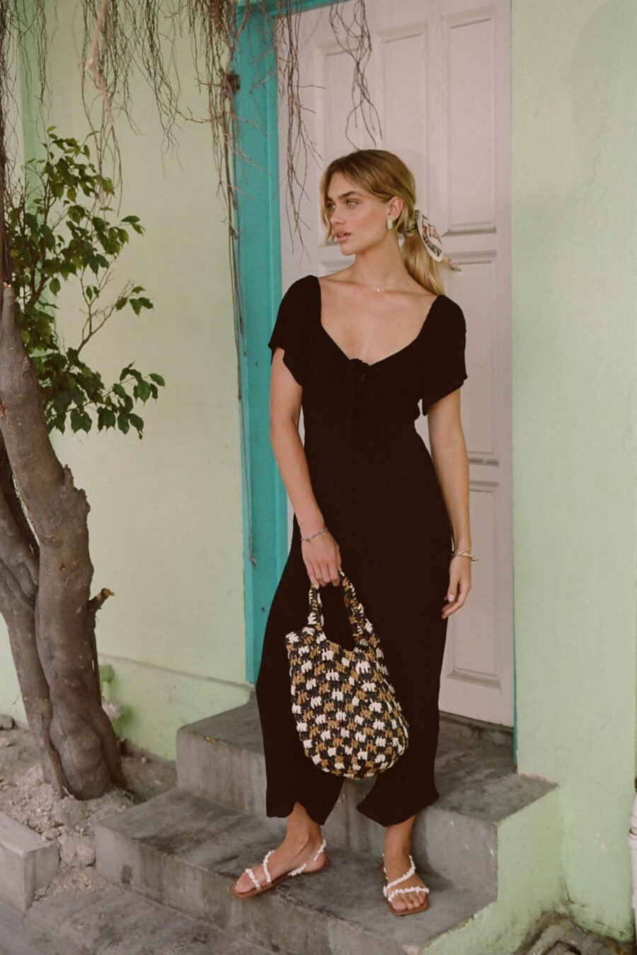 All-in-one woven jumpsuit that has a flutter sleeve design, front tie detail with cutout and solid color wash.